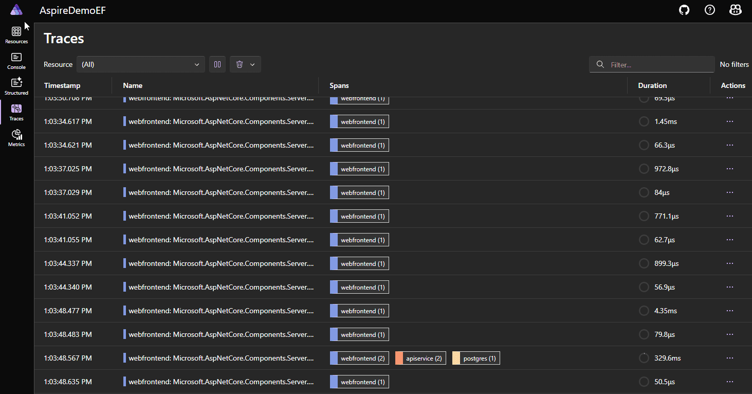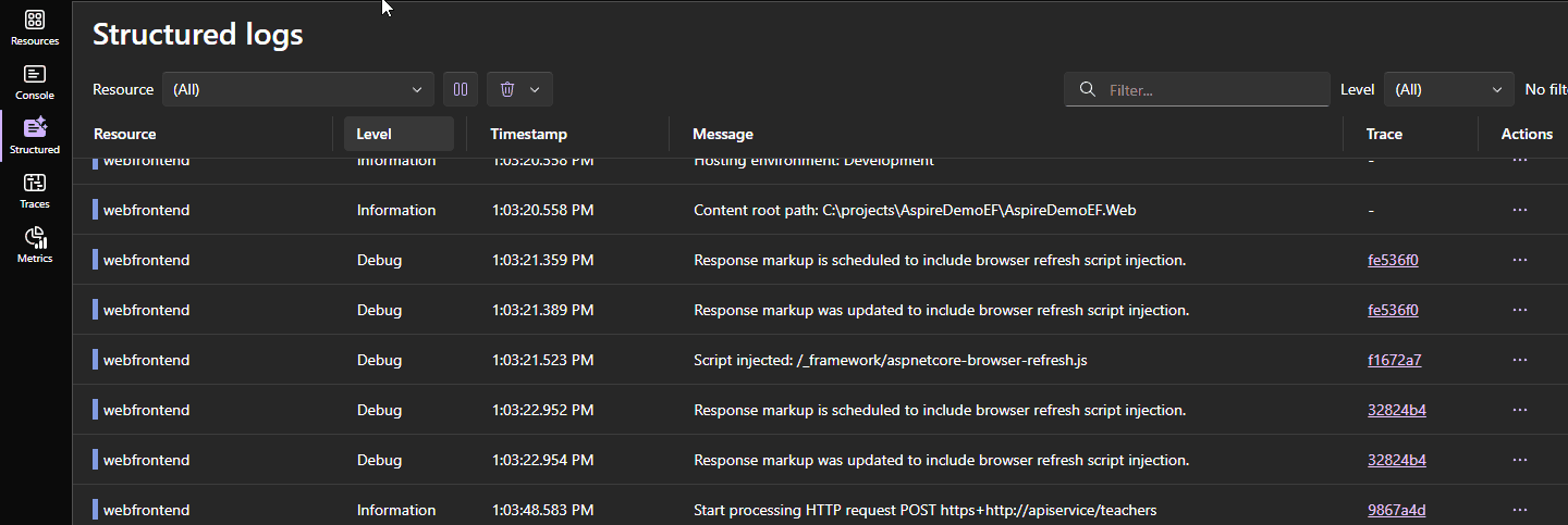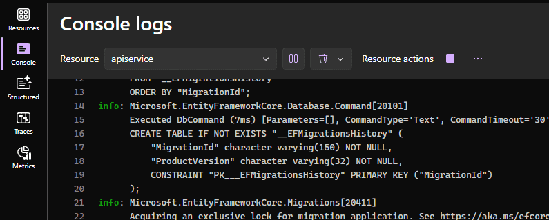 One great advantage with Aspire is that it provides support for non-.NET applications, like JavaScript SPA applications such as Angular and React. With Aspire v13, support for pulling in data for OTEL from JavaScript, NodeJs, Python, and more is supported out of the box. For basic console information, it’s built in to the default templates. For anything more, it does take a little bit of configuration and setup. You can get more direction on how to do that on the Aspire documents website.