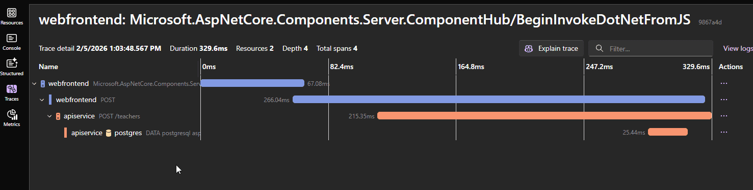 return Results.Created($"/teachers/{teacher.TeacherId}", teacher);Doing so, we can now see the custom span show up in our traces as part of the AddTeacher flow.